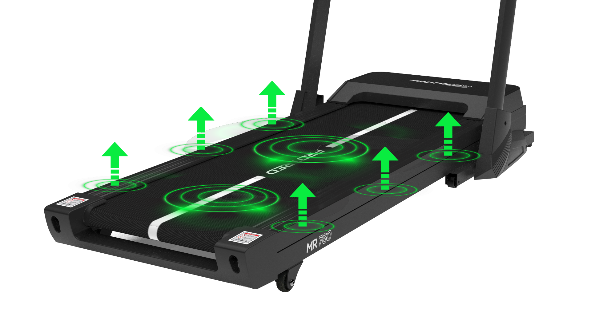 Το αντικραδασμικό σύστημα του MR-760 προστατεύει τις αρθρώσεις σας από την καταπόνηση με πολλαπλά ελαστομερή στοιχεία, τοποθετημένα κατά μήκος του δαπέδου.Το σύστημα αυτό αποσβένει την δύναμη, στο σημείο όπου ο διάδρομος δέχεται τη μεγαλύτερη πίεση, και εκτονώνει τους κραδασμούς σε κάθε σας βήμα.
