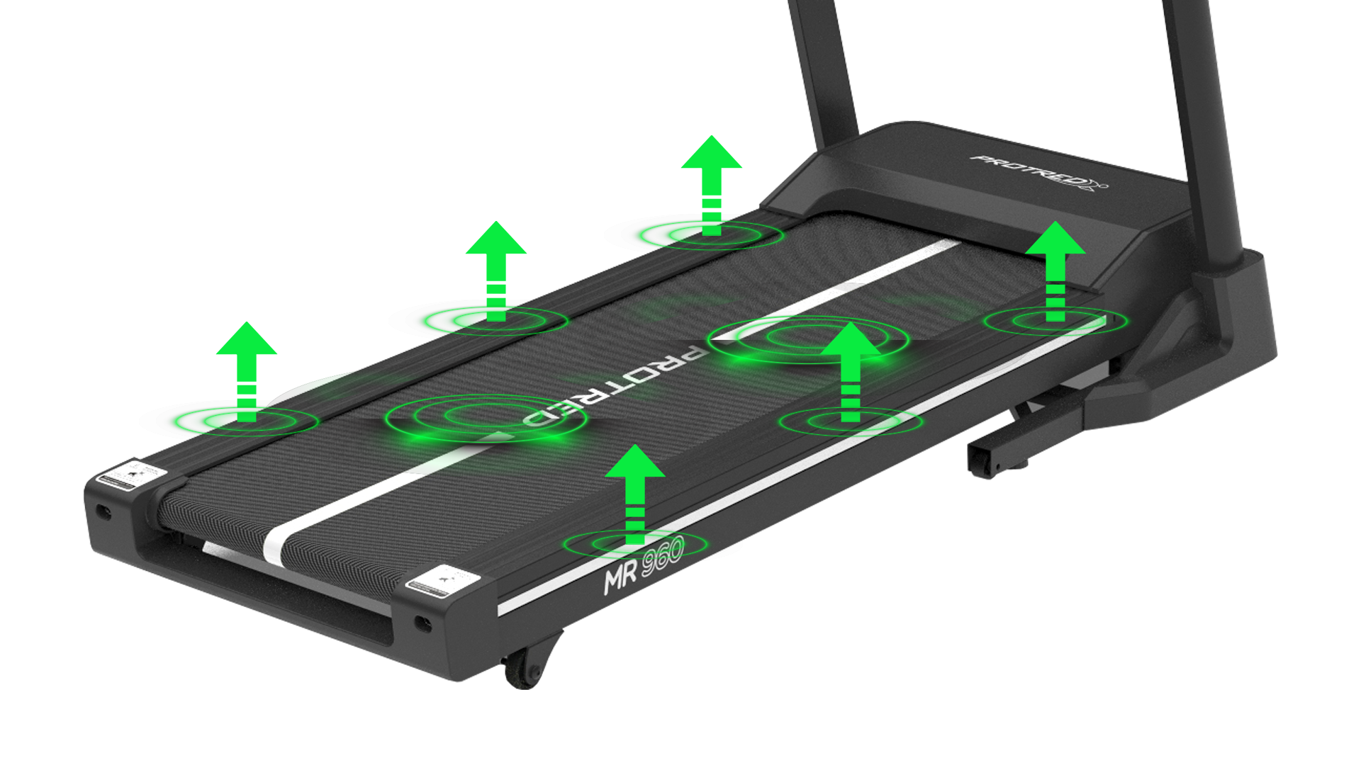 Το αντικραδασμικό σύστημα του MR-960 προστατεύει τις αρθρώσεις σας από την καταπόνηση με πολλαπλά ελαστομερή στοιχεία, τοποθετημένα κατά μήκος του δαπέδου.Το σύστημα αυτό αποσβένει την δύναμη, στο σημείο όπου ο διάδρομος δέχεται τη μεγαλύτερη πίεση, και εκτονώνει τους κραδασμούς σε κάθε σας βήμα.